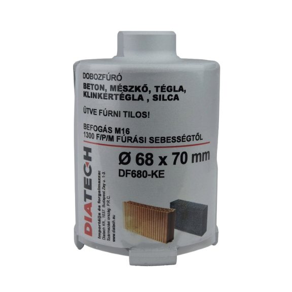 A Diatech gyémánt dobozfúró (D68×70mm) alkalmas tégla, beton és általános építőanyagok fúrására.